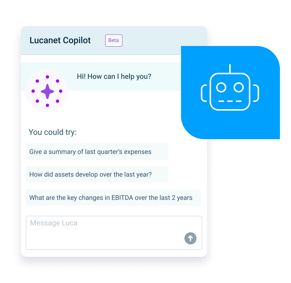 Mejore los procesos financieros aprovechando los asistentes de IA para gestionar tareas complejas y difíciles desde el punto de vista cognitivo. Lucanet Copilot reduce las actividades manuales, tediosas y que consumen mucho tiempo, para que los equipos financieros se centren en las iniciativas estratégicas que mejoran el crecimiento, la eficiencia y la innovación.