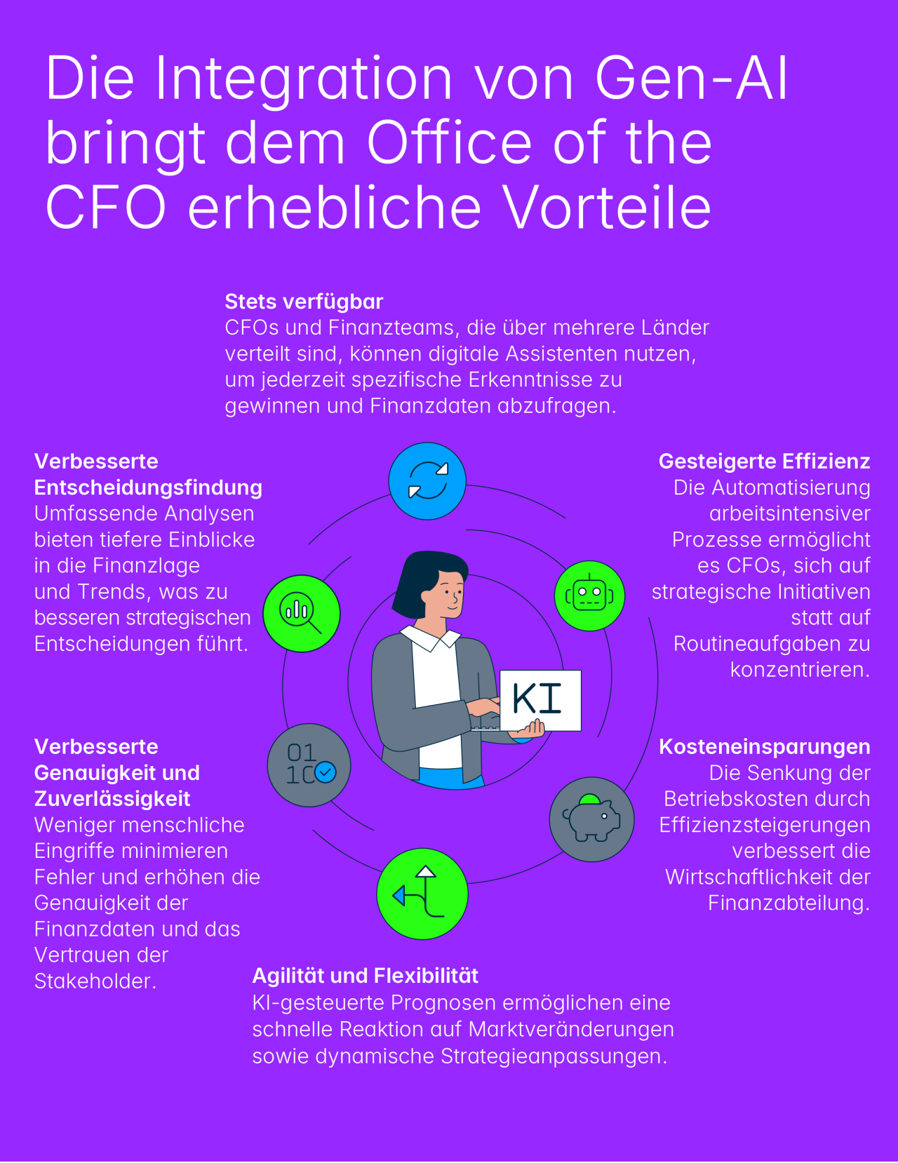 Infolge des technologischen Fortschritts entwickelt sich der Finanzsektor rasant. Wegweisend bei dieser Entwicklung ist die generative KI, ein Bereich der künstlichen Intelligenz, der die Finanzprozesse vollkommen neu gestaltet. Für das CFO Office bedeutet GenAI ein neues Maß an Automatisierung, Effizienz, Präzision und strategischen Erkenntnissen.