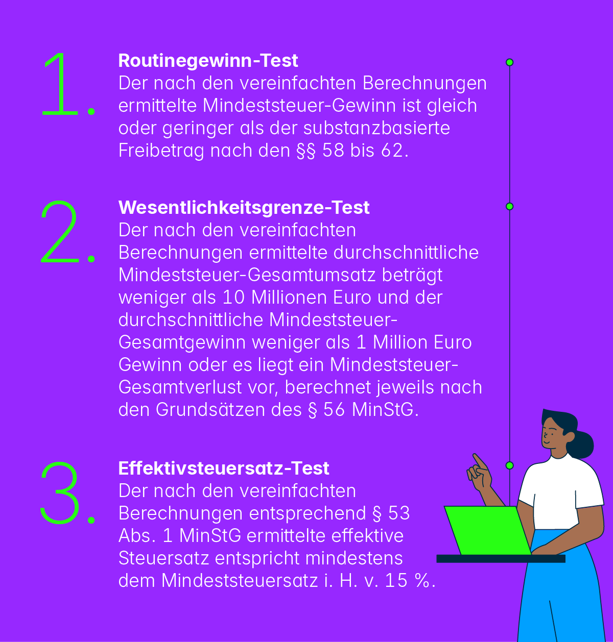 Für Zwecke des Safe-Harbours, muss eine Unternehmensgruppe im jeweiligen Steuerhoheitsgebiet einen der folgenden drei Tests erfüllen, die in § 79 Abs. 1 Nr. 1-3 MinStG aufgeführt sind: