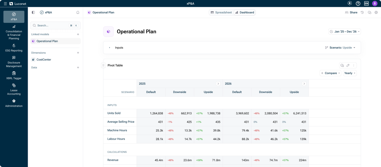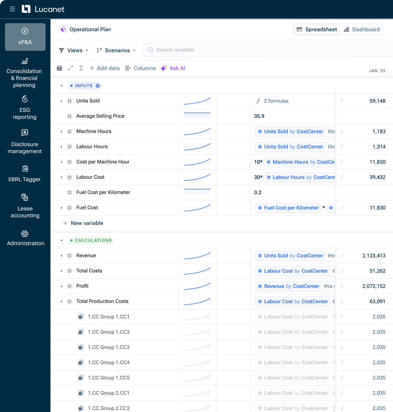 Verbessern Sie die Art und Weise, wie Ihr Team operative Strategien plant, analysiert und anpasst. Mit vernetzten Daten, flexibler Modellierung und eingebetteter KI hilft Ihnen Lucanet xP&A, schnellere und sicherere Entscheidungen zu treffen.