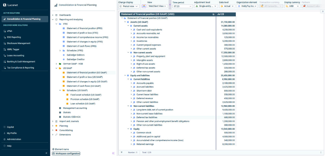 After successfully importing and assigning the items in Lucanet, you can view KiddyToy's US GAAP balance sheet in the Lucanet Consolidation and Financial Planning solution: