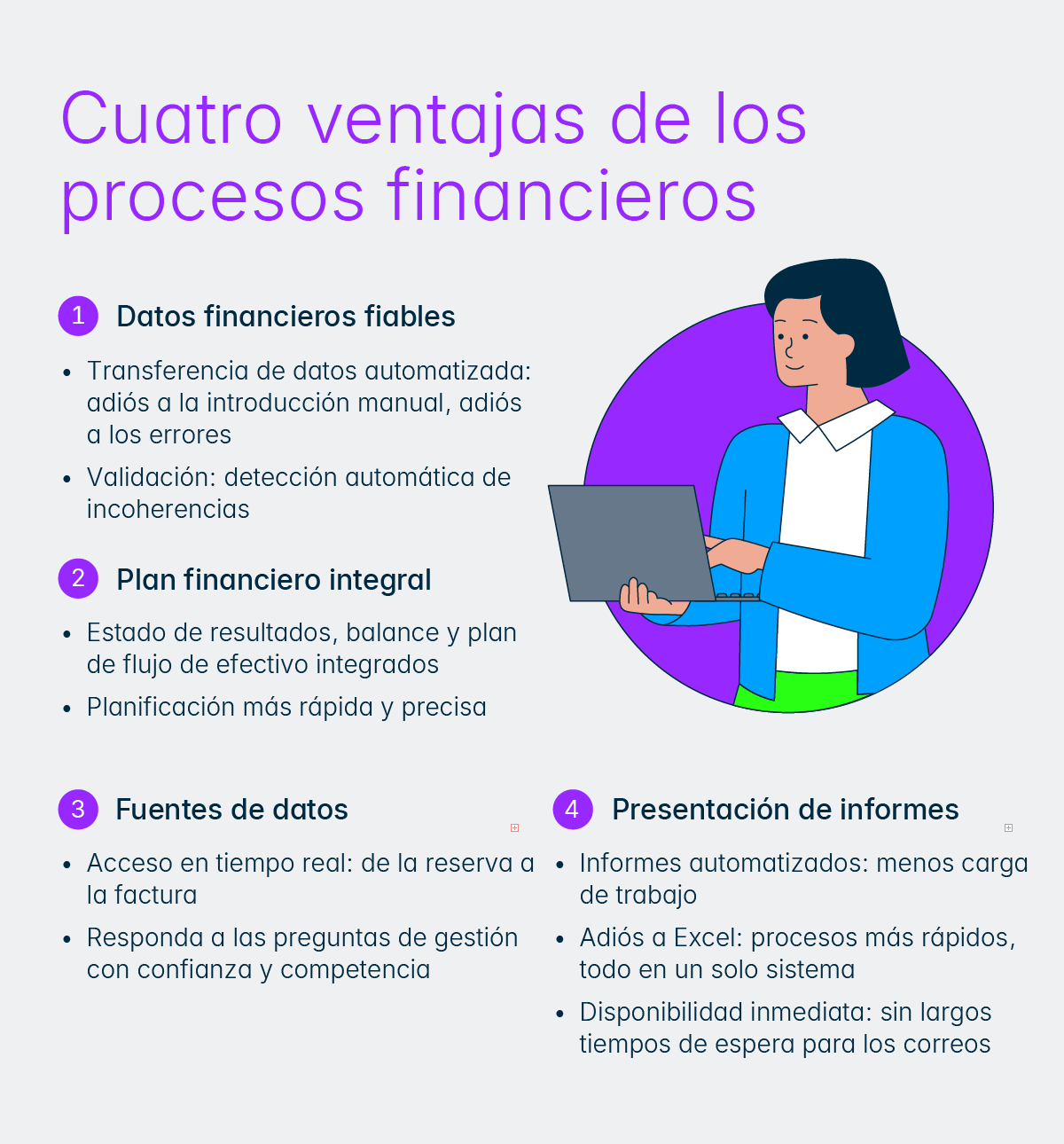 Una solución de gestión financiera puede simplificar considerablemente la gestión de los procesos financieros de su empresa. Pero ¿cuáles son las ventajas específicas de este tipo de software y qué desafíos puede ayudar a superar? En este artículo descubrirá cómo puede ahorrar tiempo y evitar errores con los procesos financieros integrados.