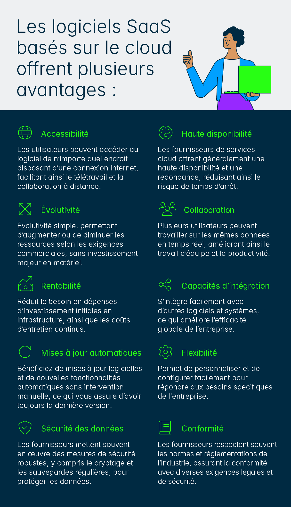 Le SaaS, qui signifie Software as a Service, est l'une des principales méthodes pour les entreprises d'adopter de nouvelles technologies. Bien que le SaaS ne soit pas intrinsèquement basé sur le cloud, en pratique, la plupart des solutions SaaS sont hébergées à l'aide de logiciels cloud, ce qui est l'une des principales raisons pour lesquelles ce modèle a été si largement adopté.