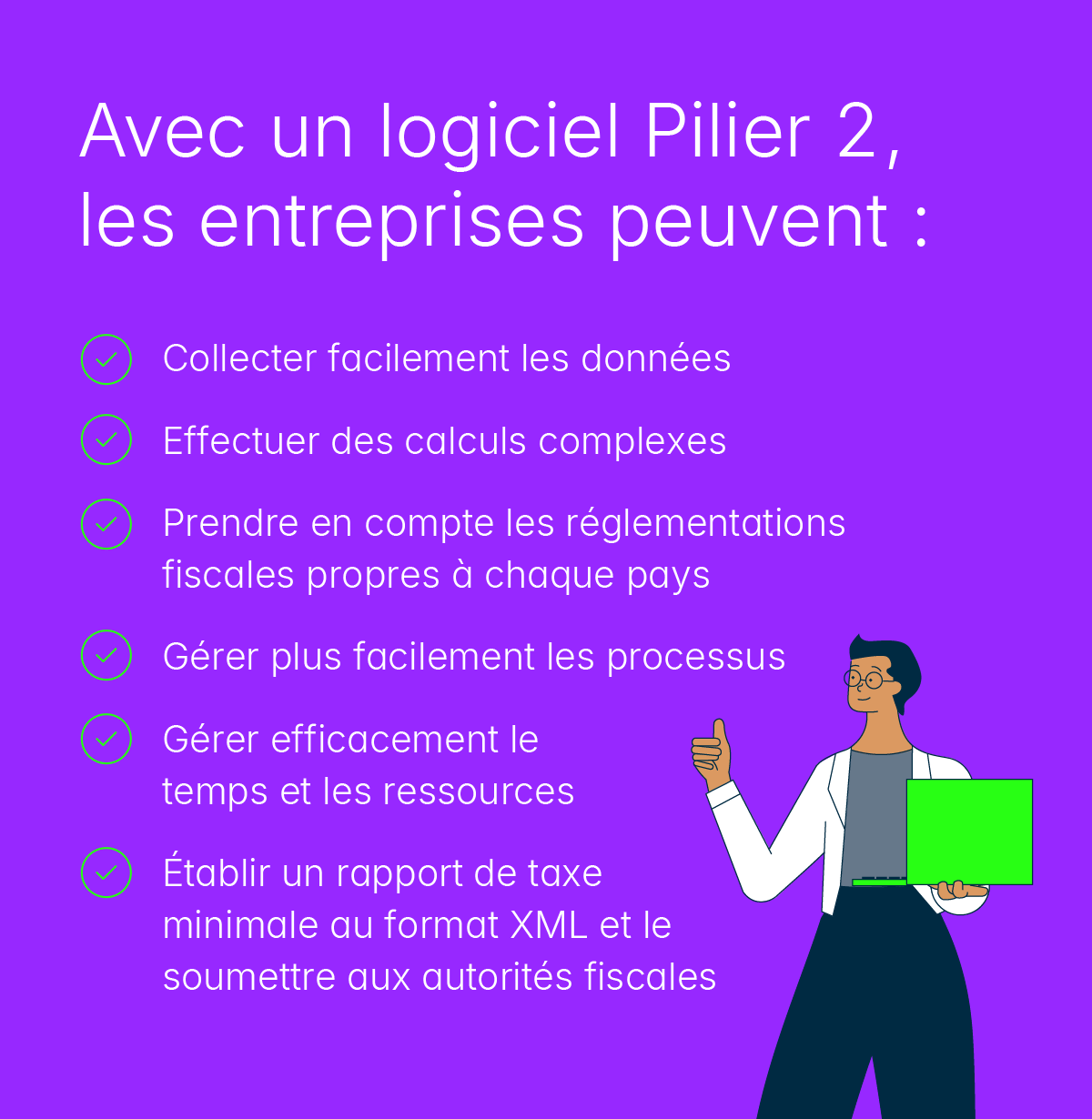 Solution logicielle : Avec les outils dédiés au Pilier 2, vous pouvez modéliser les règles spécifiques de chaque pays pour le calcul des impôts complémentaires nationaux et générer des rapports de conformité fiables. Des contrôles intégrés permettent une surveillance proactive : le logiciel détecte et signale les anomalies avant qu’elles ne posent problème.