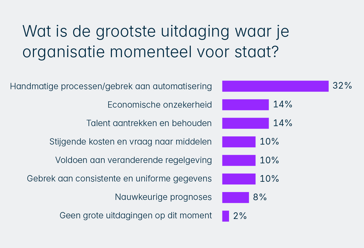 Uit een enquête onder 50 senior finance professionals tijdens Lucanet World 2025, blijkt dat 32% een gebrek aan automatisering de grootste operationele vindt. Een op de vijf (22%) noemde dit als hun belangrijkste investeringsprioriteit voor de komende 12-18 maanden.