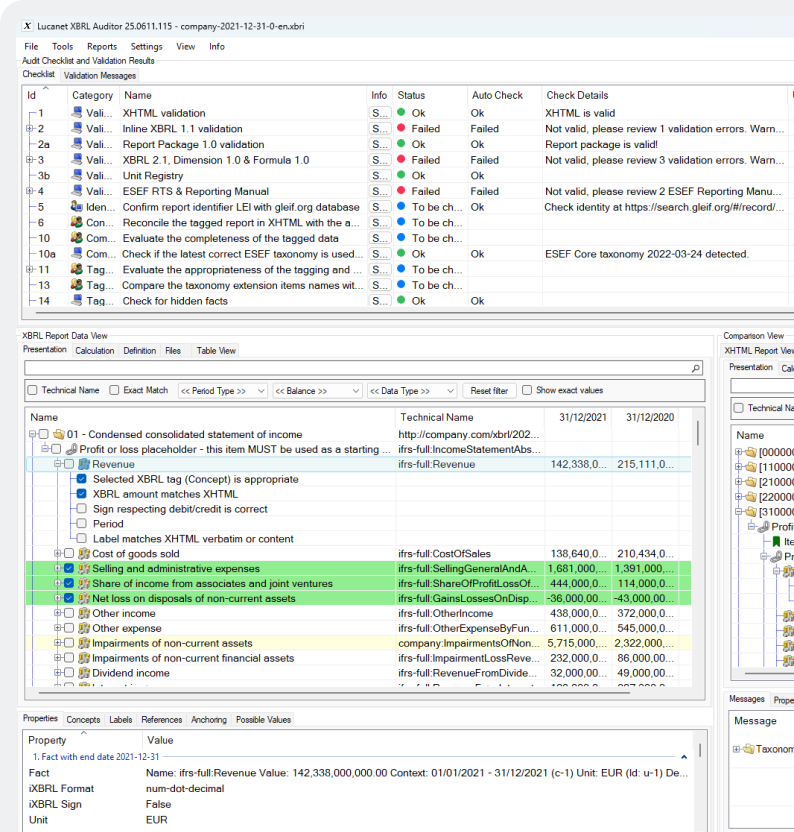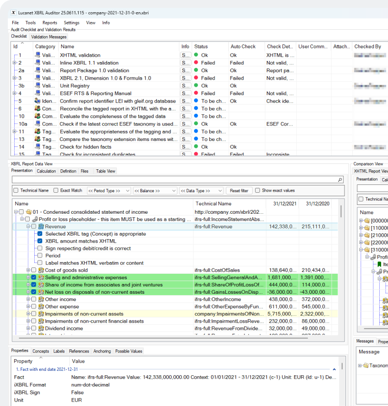 Geautomatiseerde validering en foutdetectie voor XBRL-specificaties en ESEF-indieningsregels, waardoor compliance en efficiëntie tijdens audits worden gegarandeerd.
